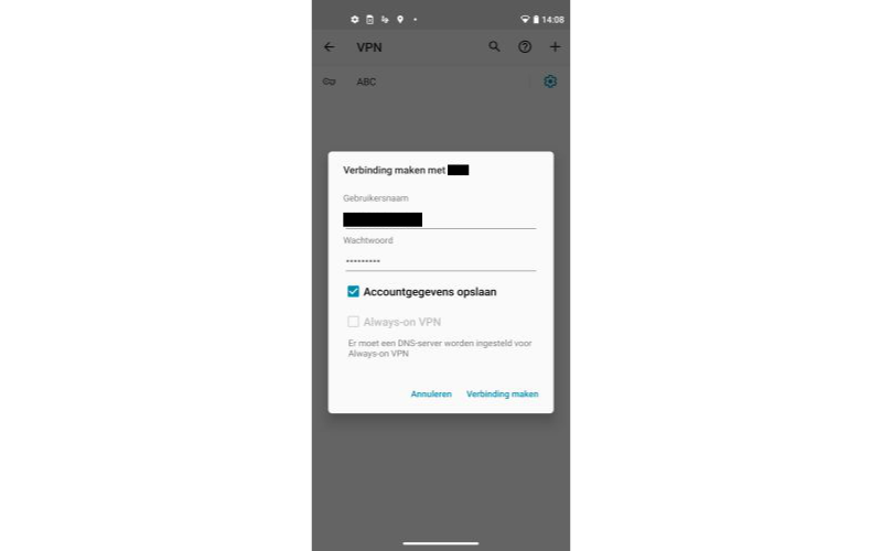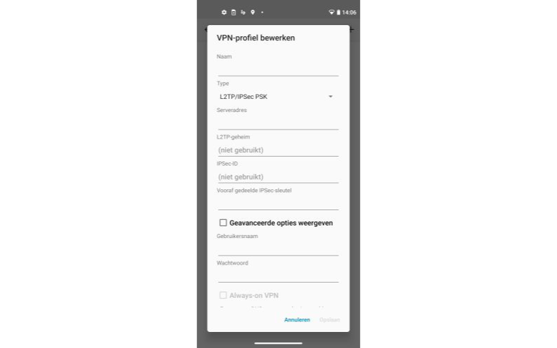 Vooraf gedeelde IPSec-sleutel: per mail verstrekt (L2TP sleutel)